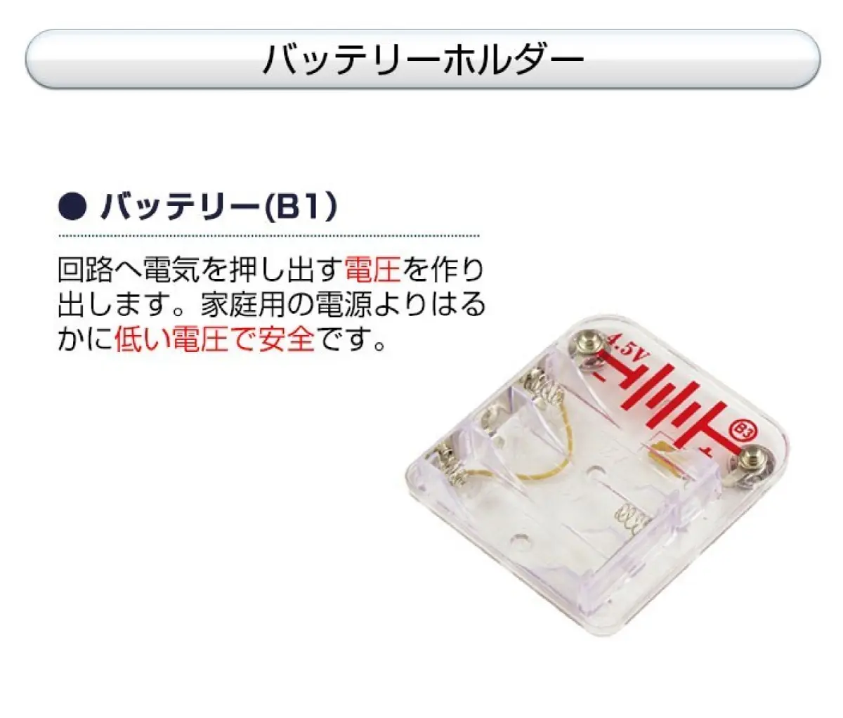 | 商品内容 | ベースボード(盤面)・スナップワイヤー・ジャンプワイヤー・ギア・送風機・バッテリーホルダー・スイッチ・その他回路・実験ガイド・ミニドライバー ※パーツの数量や種類は、シリーズにより異なる。 詳しくは、パーツリストをご覧ください。 |